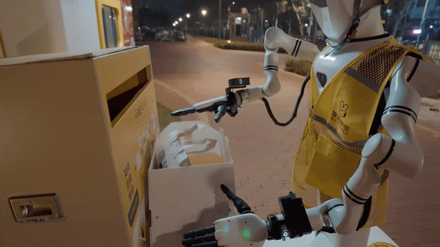 视频里,一个穿着黄色马甲的机器人在夜晚独自完成了一整套外卖配送任务:先是拆开外卖回收箱、取出外卖袋、把空箱子折叠好投进回收口,然后拎着外卖袋走到办公楼,自己按电梯、坐电梯上楼,最终把东西送到3楼目的地。