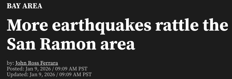 根据美国地质调查局(USGS)发布的消息,当地时间周五上午,东湾圣拉蒙(San Ramon)地区再次发生多起小规模地震,引发居民关注。kron4报道标题