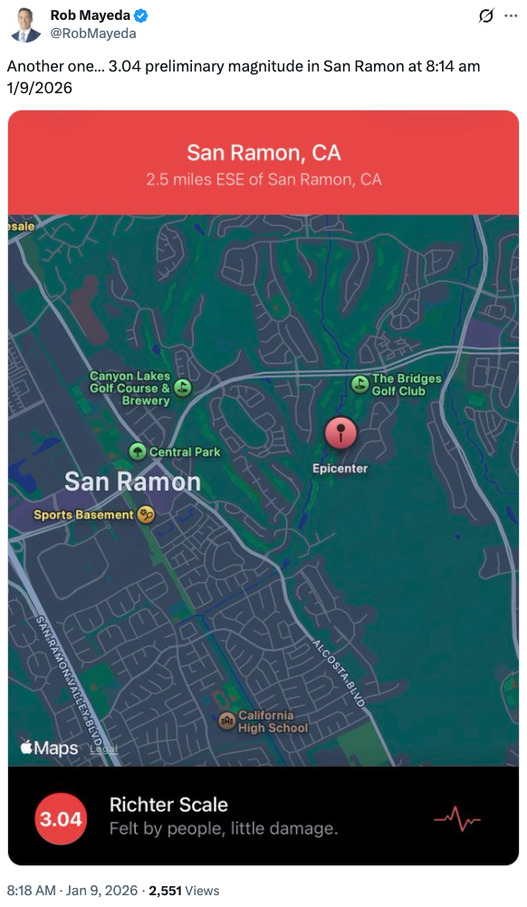 上一次是在12月28日(上周日),当时USGS通报称,28日上午11点56分左右,东湾地区发生了2.8级地震,震中位于圣拉蒙附近。都柏林(Dublin)和迪亚波罗(Diablo)等地均有震感。