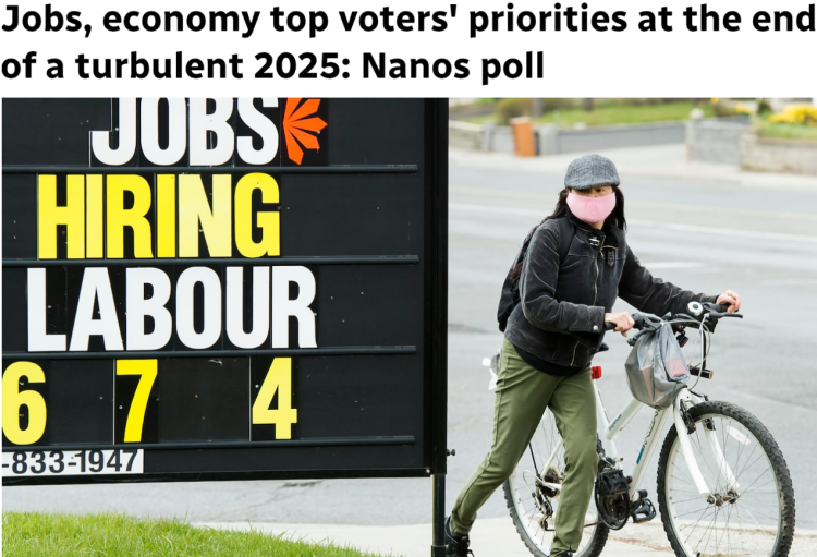 Nanos 首席数据科学家尼克·纳诺斯(Nik Nanos)表示,在整个 2025 年期间,经济问题与对美关系一直在选民关注重点中轮流占据首位。
