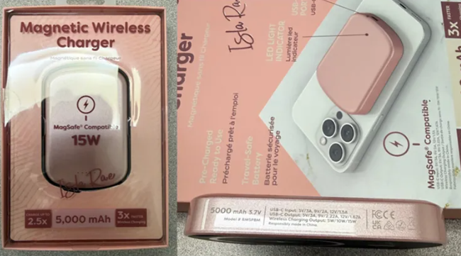 这些以 Isla Rae 品牌销售的磁吸式无线充电器于 2024 年 6 月至 2025 年 11 月期间在全美各地的 TJ Maxx 和 Marshalls 商店上架。美国消费品安全委员会 (CPSC) 表示,这些纤薄的产品(如图所示,可以放在 iPhone 上)每个售价 15 美元,有紫色、白色和粉色三种颜色,型号为“RM5PBM”。