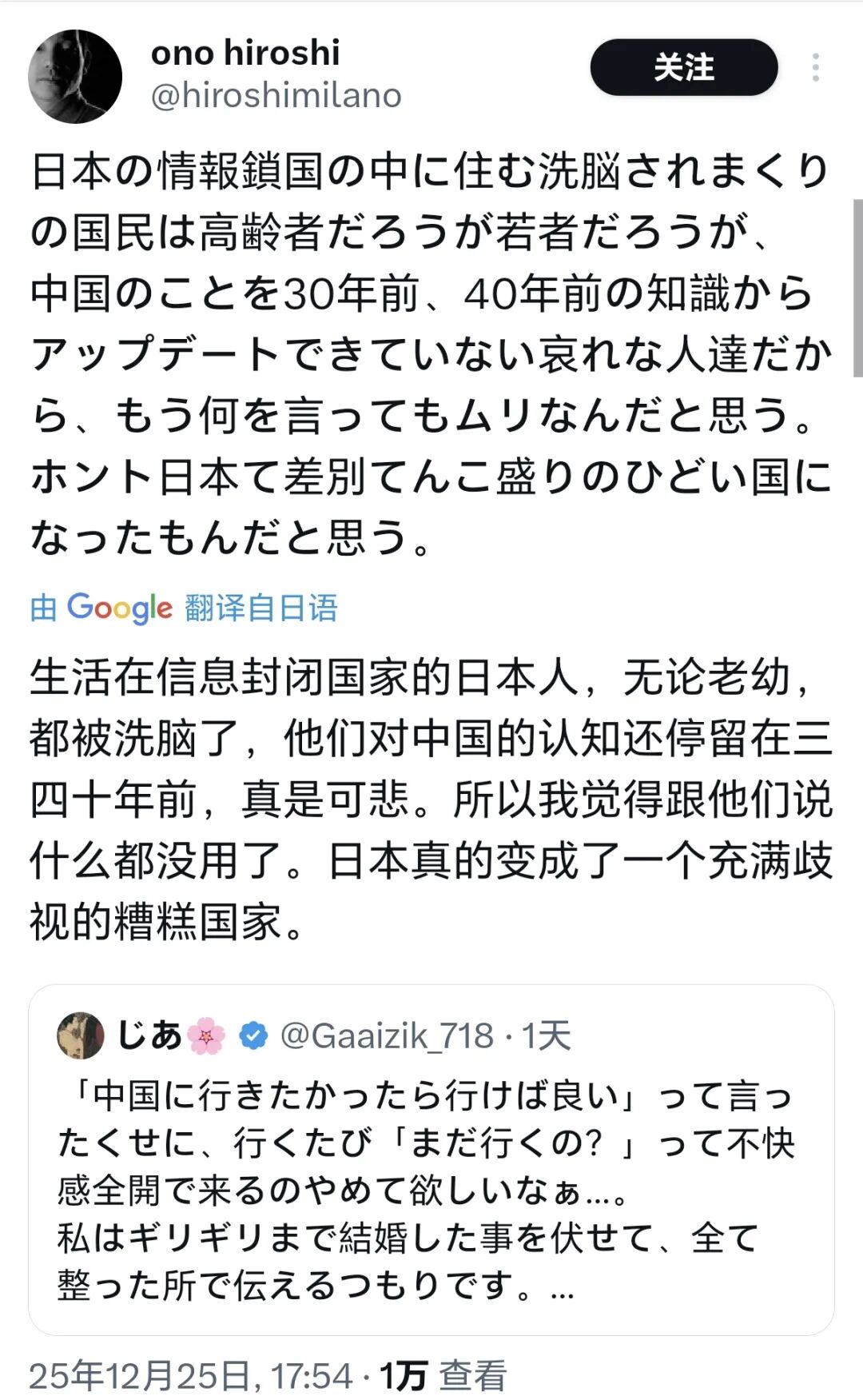 “我认为,那些生活在日本信息锁国环境中、被彻底洗脑的国民,无论是老年人还是年轻人,都很可悲——他们对中国的认知仍停留在30、40年前的水平,根本无法更新。事到如今说什么都无济于事了。说真的,日本已经变成一个歧视泛滥的糟糕国家了。