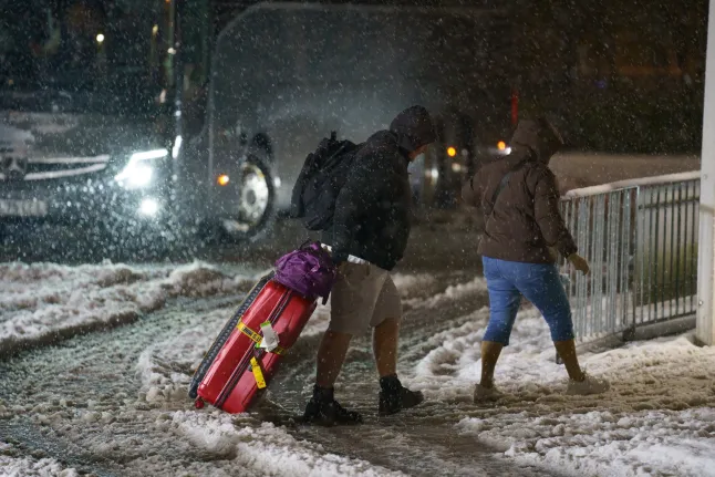 航班取消后,乘客冒着大雪、拖着行李箱离开机场