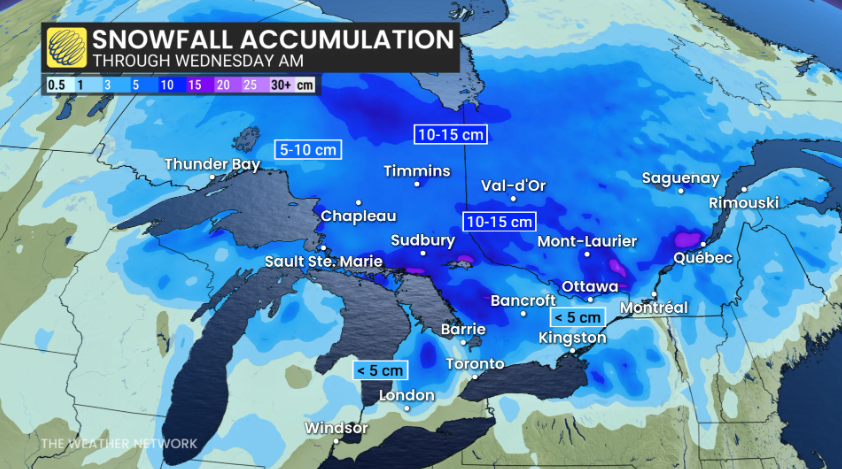 周三至周四的降雪量仍存在较大不确定性,尤其是安省东部地区。随着该系统在魁北克地区增强,周四可能会在金士顿以东形成较强降雪带。之后,西北冷风将触发湖效雪,预计会持续至周末。