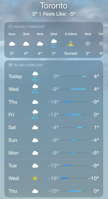 此外,打开手机(Apple Weather)一看,多伦多接下来一周又是“不见天日”,还请大家及时关注天气,尤其是“忽上忽下”的气温: