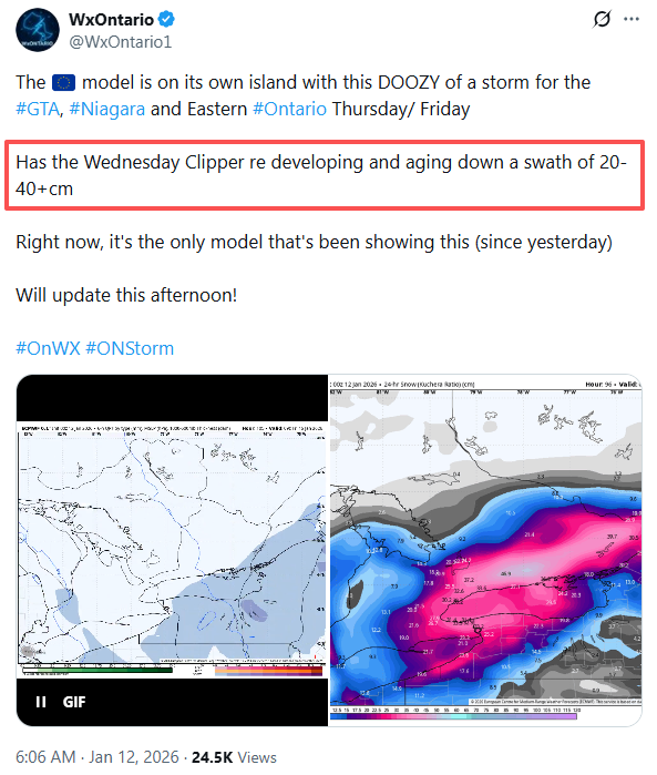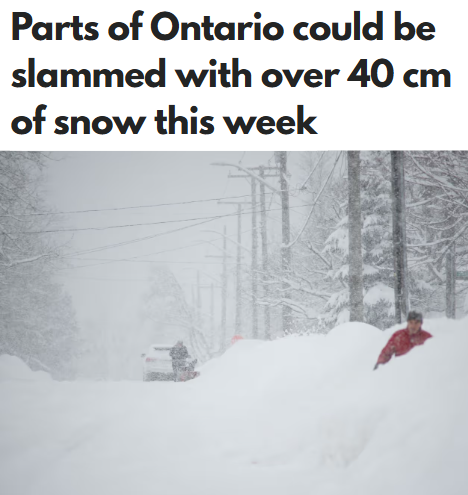 目前天气网络的预测显示,受影响地区的降雪总量可能从不足10厘米到25厘米不等。但是,也有专家(X@WxOntario1)表示,在不同天气模型下,预计部分地区可能有20厘米到40厘米的降雪,甚至有地区恐怕会有接近47厘米。