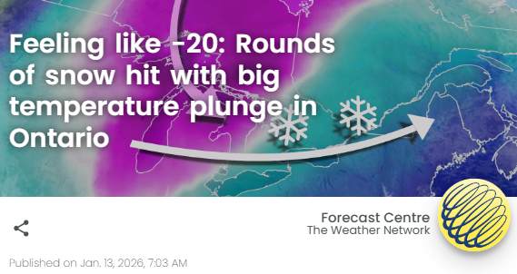 安省本周将迎来天气模式的大幅变化。经历了短暂的一月回暖后,气温将骤降,北极寒流(Arctic air)和降雪将席卷五大湖地区。安省短暂的一月回暖马上就会结束,凛冽寒冬将卷土重来。
