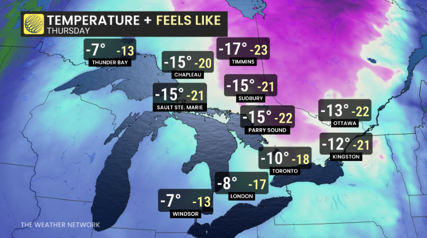 到周四,包括大多伦多地区(GTA)在内的部分地区,白天气温可能会有-10℃以下,风寒指数甚至可达-20℃。