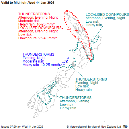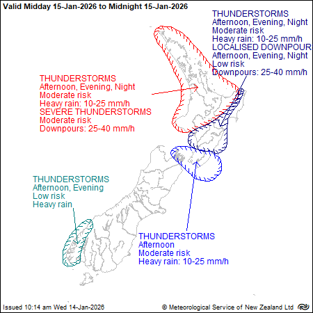 今天(1月14日)下午起,北岛北部地区,包括北地、奥克兰、科罗曼德尔半岛、怀卡托-陶波、Taihape东部、霍克斯湾南部以及丰盛湾西部(包括罗托鲁瓦),将出现中等程度的雷暴风险。