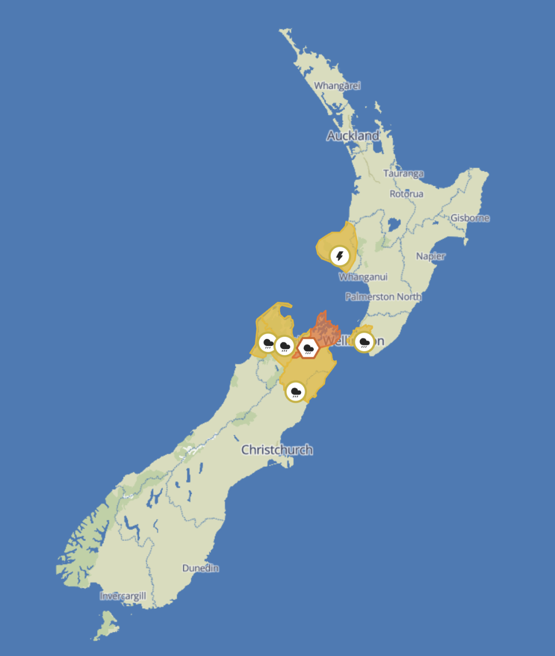 怀拉拉帕南部、Kapiti南部、惠灵顿和马尔堡峡湾地区出现雷暴伴随强降雨的风险为中等,下午降雨量可达每小时10至25毫米。