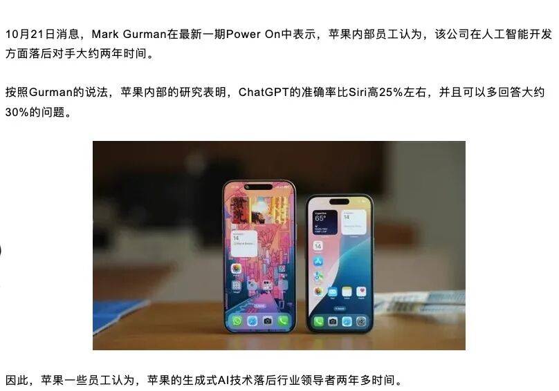 2024年iOS 18发布的时候也推出了点AI功能,结果总体评价下来,只能说跟大家期待的苹果标准差得有点远,虽然后续也一直有迭代。可行业内都说苹果AI掉队了,甚至苹果自家员工还说落后行业两年。。。