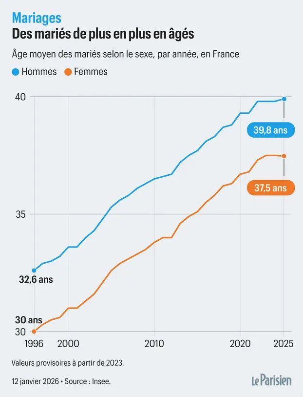 数据显示,在刚刚过去的2025年,法国男性的平均初婚年龄已经逼近40岁大关,达到了39.8岁,而女性也紧随其后,平均年龄为37.5岁。对比五十年前那平均24岁的青葱岁月,这足足跨越了十六年的光阴。