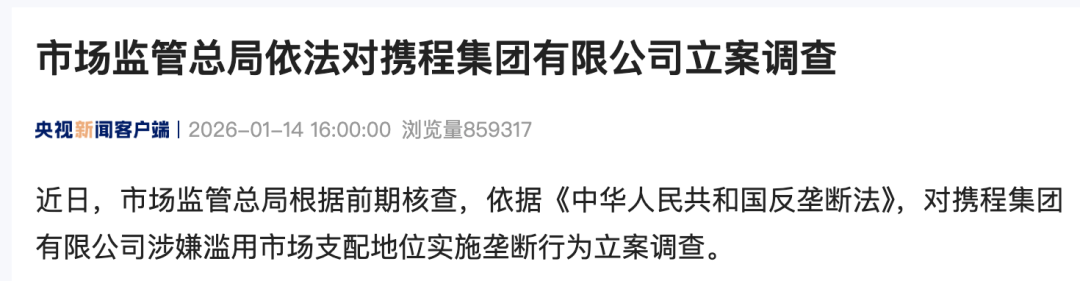 在此背景下,作为行业龙头的携程,成为监管的重点关注对象。在今年1月14日被市场监管总局立案调查前,2025年下半年,携程已在多地接连被市场监管部门约谈。