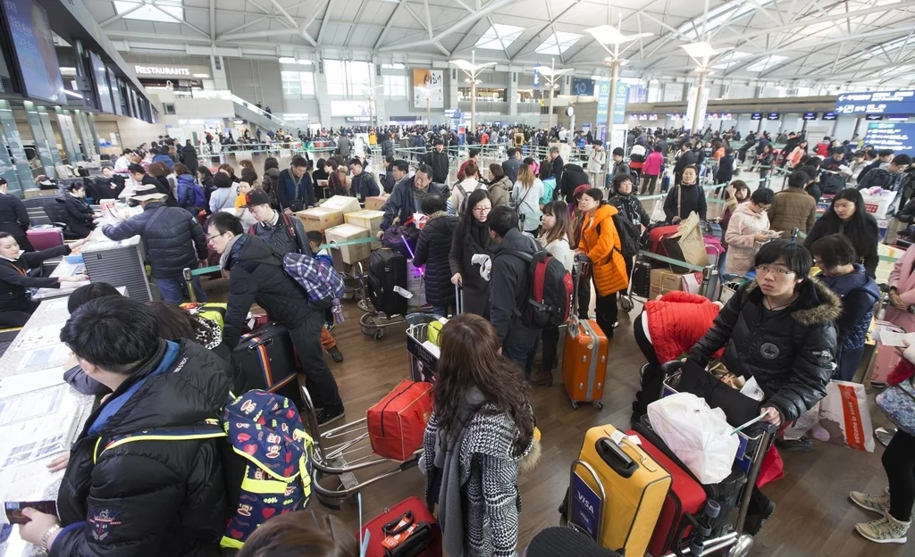 韩国机场中国游客大排长龙。 东方IC
