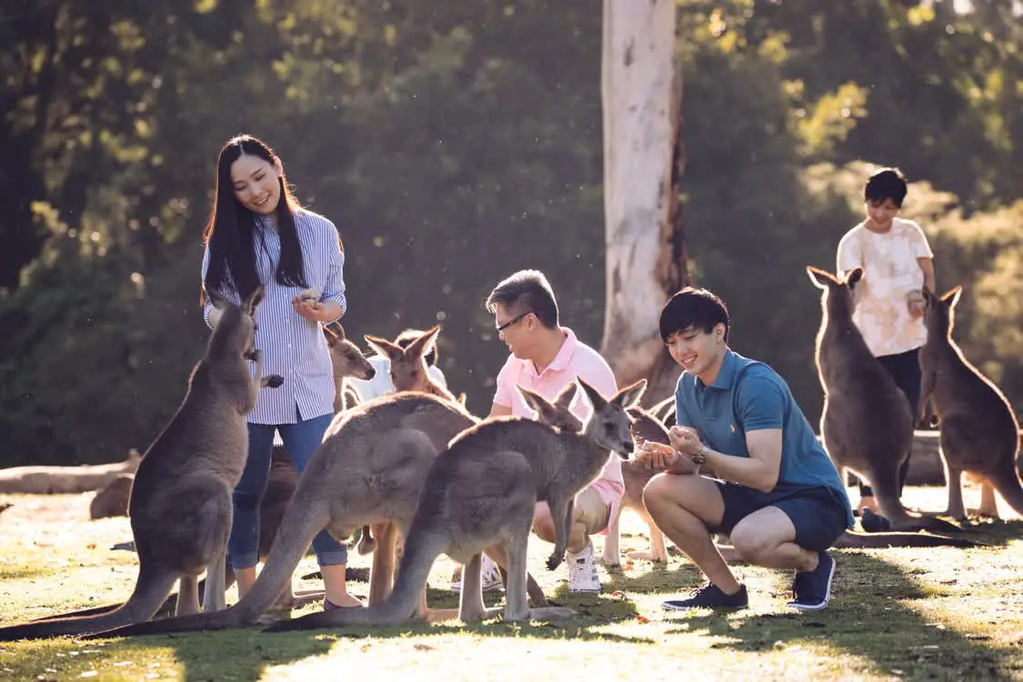 中国游客在澳大利亚与袋鼠近距离互动。 澳大利亚旅游局