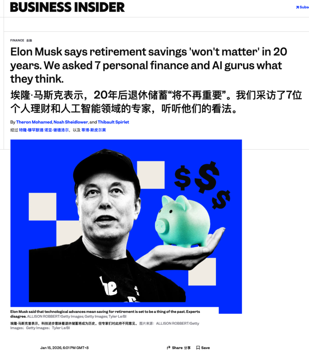 最近,商业内幕网站Business Insider就这个话题,采访了七位个人理财和AI领域的专家时,他们的反应出奇一致:不要听马斯克的,你真的应该为退休存钱。还有专家表示,“对于马斯克在其核心专业领域之外说的任何话,我都不会当真。”