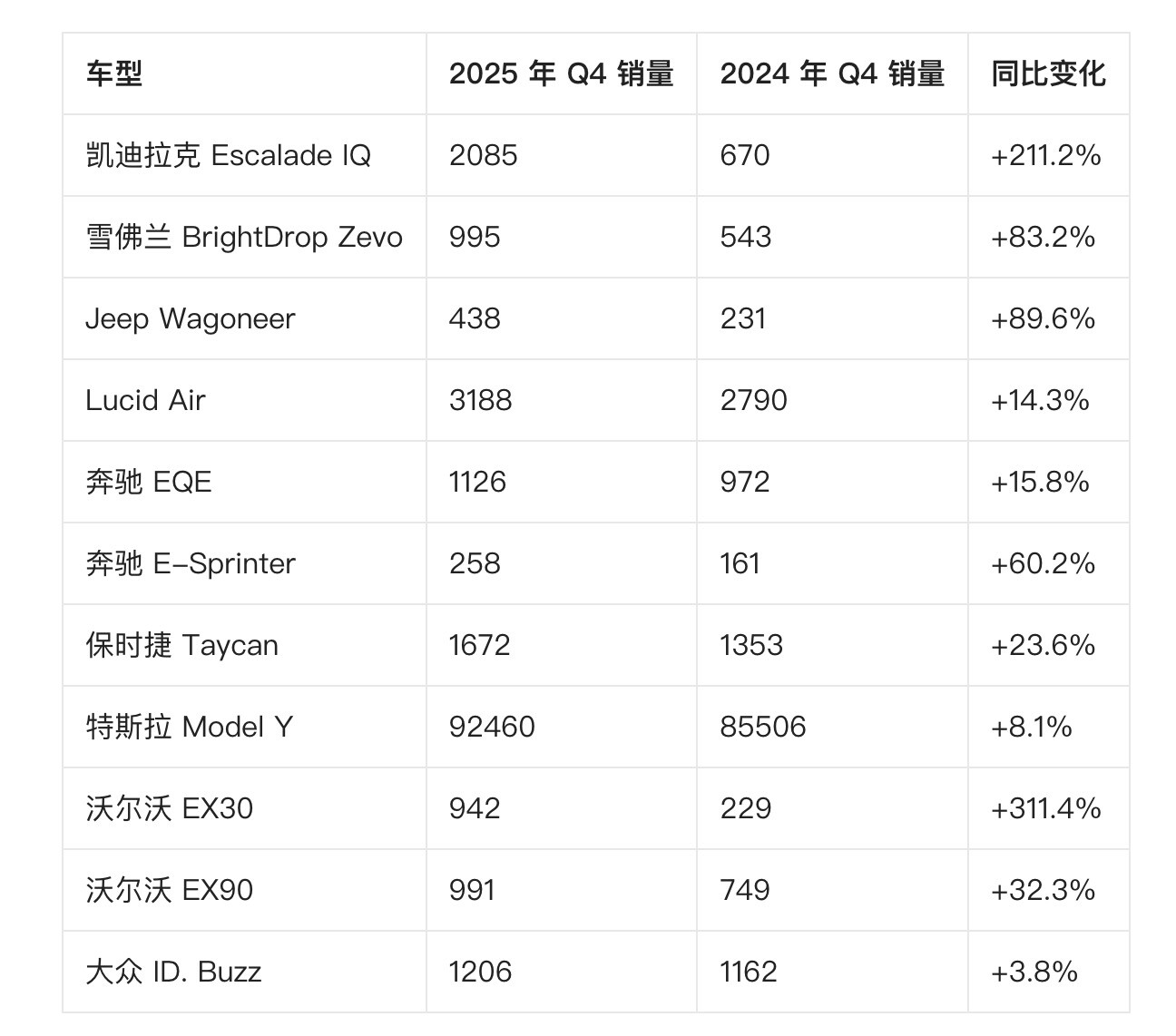 部分车型的增长原因较为直观。例如,凯迪拉克 Escalade IQ(即“纯电凯雷德”)在 2024 年末仍处于产能爬坡阶段,因此 2025 年末的销量提升本就在预期之中。