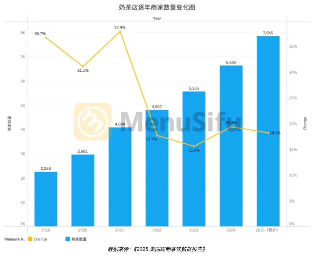《报告》指出,2025年美国奶茶店数量预计为7845家,在千禧一代成为消费主力的未来十年间,美国潜在的奶茶门店规模可能再扩大5到10倍。