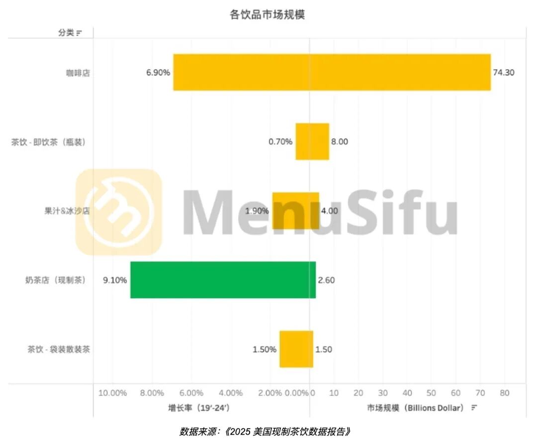 MenuSifu《2025美国现制茶饮数据报告》(下称“报告”)显示,2025年美国现制茶饮市场规模为26亿美元,并且还在以9.1%的年增速快速扩张,预计2030年市场规模将突破80亿美元,这个增速和规模都非常有吸引力。