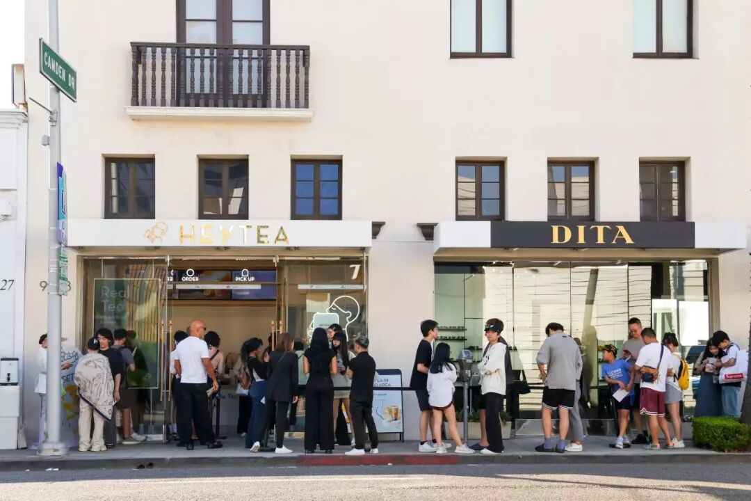霸王茶姬的路子,就显得更“雅”一些。2025年5月,它在洛杉矶比佛利山庄旁的Westfield购物中心开设北美首店,主打文化输出,靠讲故事吸引消费者。