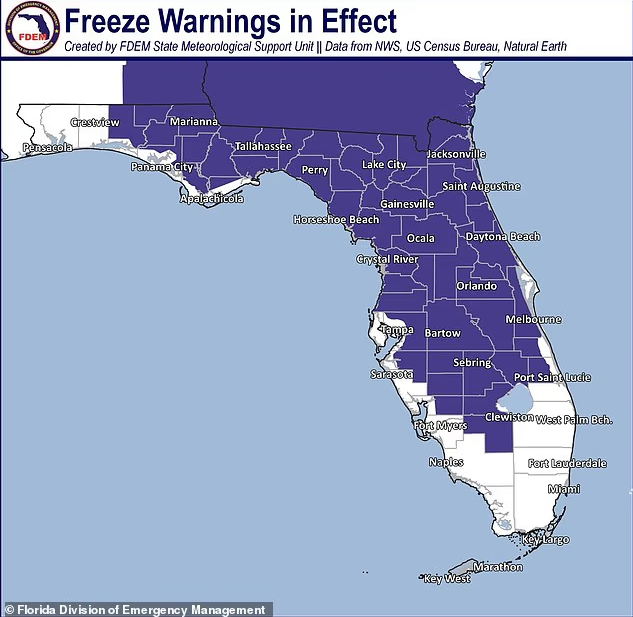 国家气象部门警告,从佛州北部一直到南部的圣露西港(Port St. Lucie)和迈尔斯堡(Fort Myers),均可能出现霜冻风险;包括迈阿密、劳德代尔堡和西棕榈滩在内的地区,也被纳入寒冷天气警报范围。