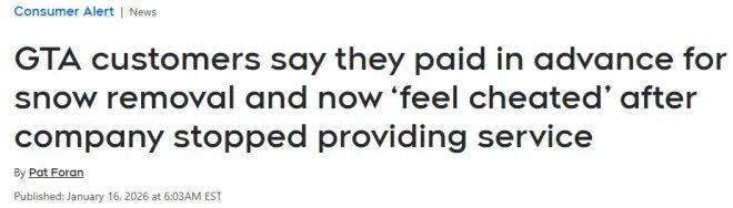 涉事公司名为Snow Pros,登记地址位于Woodbridge,通过网络和社交媒体进行宣传。该公司在去年秋天曾向客户表示,如果提前支付2025-2026冬季的除雪费用,可享受折扣。