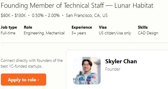 GRU目前正在招聘一名“创始技术团队成员”,年薪为8万至13万美元。招聘广告写道:“你将负责必须在真空、月壤、极端温差以及人类生命维持条件下长期存活的结构与机械系统。这是一个高度系统化、强动手、责任极高的岗位。”