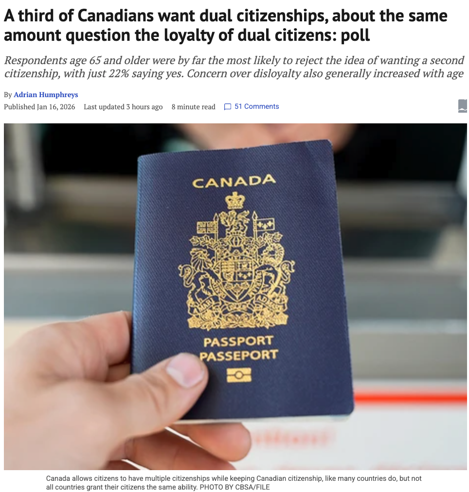 民意调查显示,个人对拥有双重国籍的兴趣因年龄和在加拿大的居住地而异。