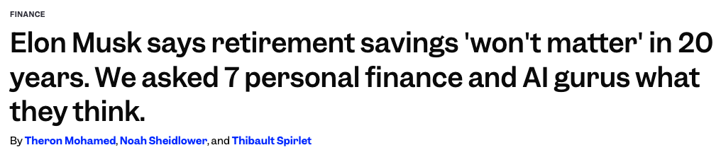 本月早些时候,马斯克在播客节目《Moonshots with Peter Diamandis》中表示:“不用为10年或20年后的退休存钱,这没什么意义。”
