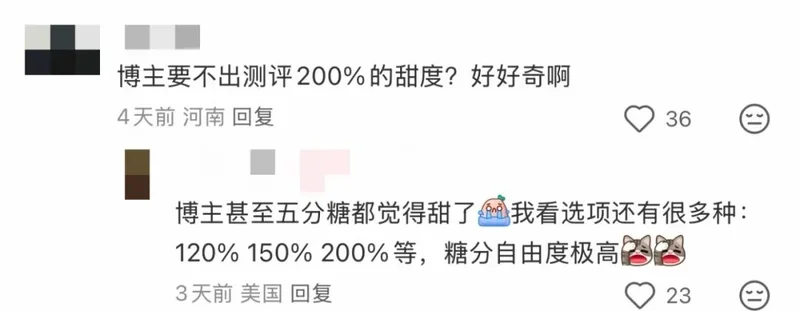 但在美国,蜜雪提供了8档甜度选择,并新增了一个高达200%糖的选项,明显迎合美国消费者对高甜饮品的偏好。