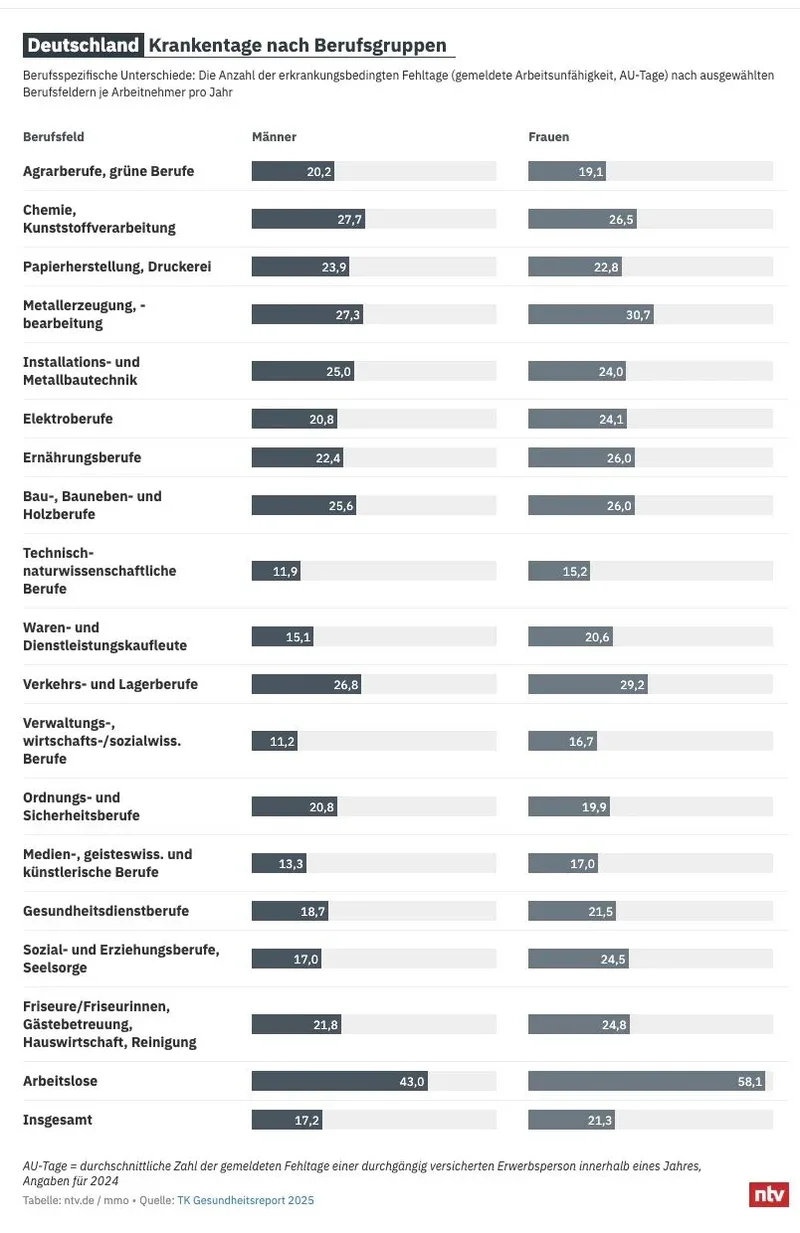 那么,德国的病假水平究竟处于什么位置?不同统计口径给出的答案并不完全一致。联邦统计局统计的是“病假工作日”,而德国多家法定医保机构则以“日历日”为单位。以DAK健康保险的数据为例,2025年其投保的在职人员平均病假天数为19.5日,病假率为5.4%,与前一年基本持平。德国TK保险在2025年1月至11月的统计中,给出的平均病假天数为16.98天,甚至略低于上一年。