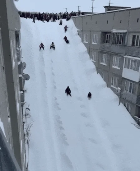 更有视频在网上疯传——孩子们站在楼顶,顺着积雪一直滑到地面。不少人的第一反应是:这肯定是AI。