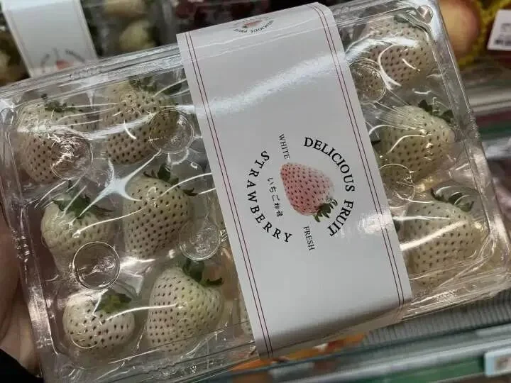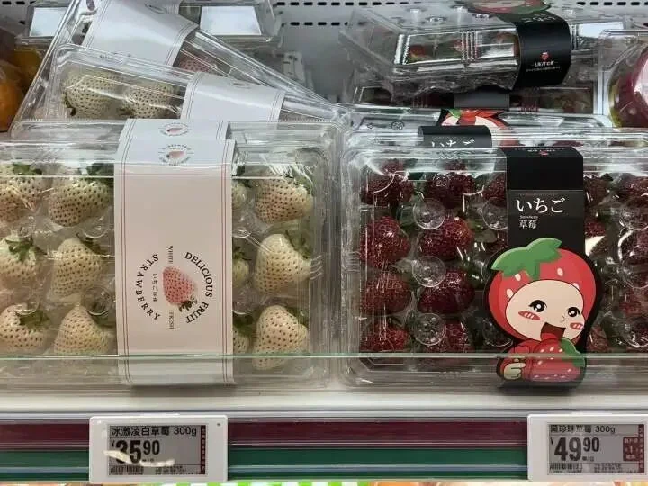 其中“白草莓”的商品名是“冰激凌白草莓”,产地是山东青岛平度,价格是35.9元一盒(300克)。