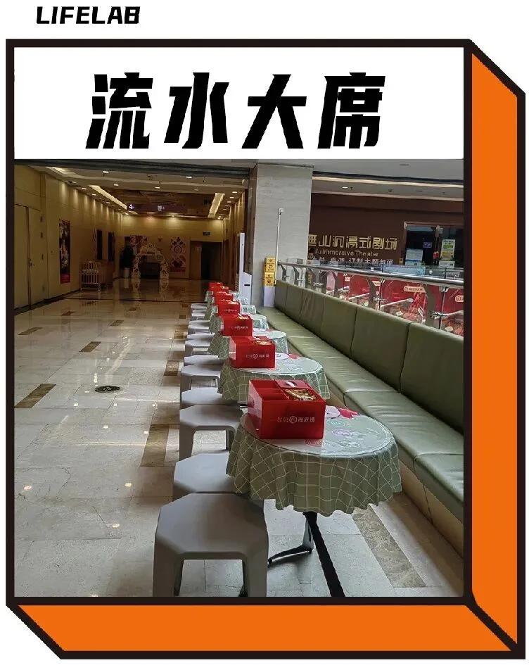 于是年轻人发现,明明是想在饭点去商场里吃个饭,结果像是走进了农村大席,一分钱没花就莫名其妙地摄入了一万卡路里。
