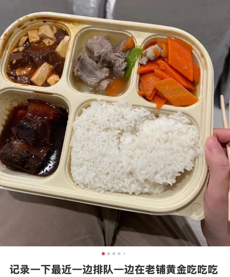 先是一些高端品牌开始给排队的人发自助餐,比如老铺黄金,有些门店每天中午都会给排队的顾客发放盒饭,两荤两素营养均衡;下午茶时间专门请了男模,来回走动给大家派发Godiva的巧克力。发的水是十几块一瓶的依云,橙汁是NFC的,就连充饥的小面包,也是从手工烘焙精品店买来的。“不知道还以为自己是来当排队群演的。”