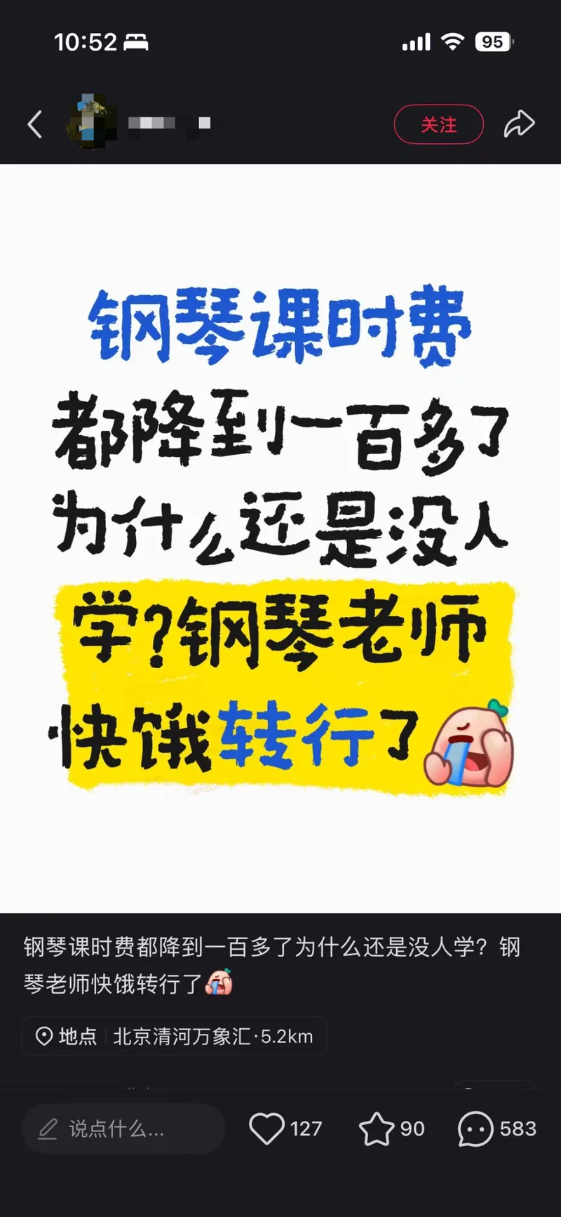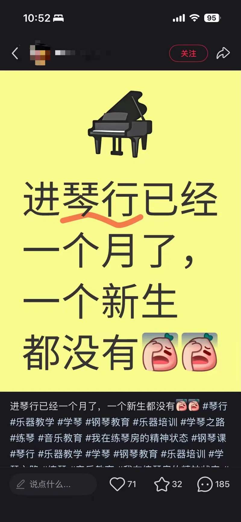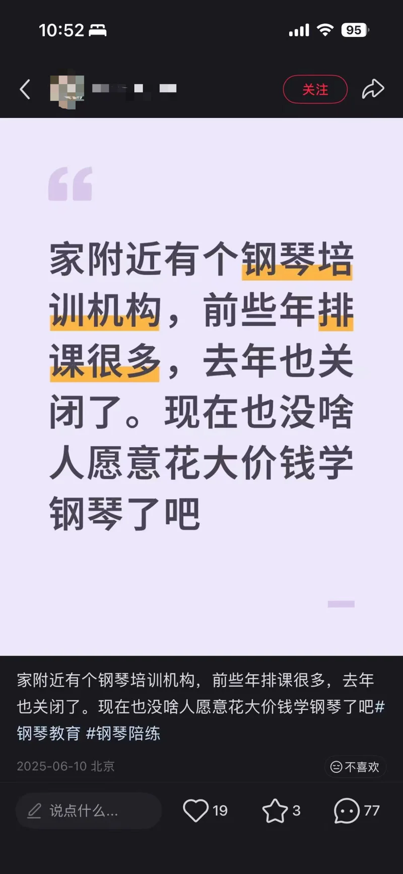 小红书用户的分享,钢琴培训行业现在不好做了/图源小红书