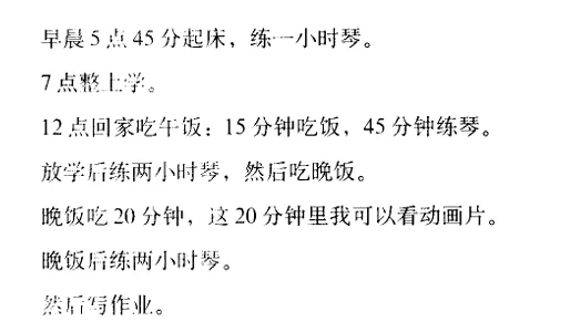 郎朗并不是靠天赋“躺赢”的,成为钢琴巨星意味着超凡的天赋与艰辛的努力。图为郎朗自述小学时期的练琴时间表[28],郎朗的父亲郎国任长期监督陪同,有多少家长和孩子真的能做到呢?