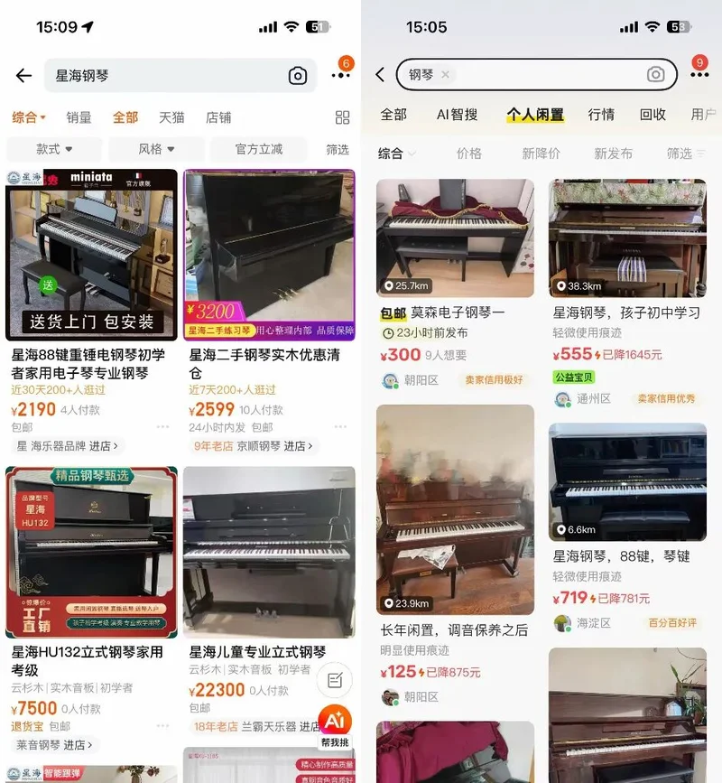 星海钢琴在淘宝和闲鱼上的价格对比,二手市场打对折也无人问津/APP截图