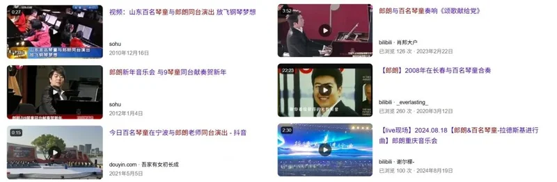 搜索“郎朗”“琴童”“同台”的相关字样,可以看到2010年左右就有相关的搜索结果,“和大师同台演出”的商业模式经久不衰/网页搜索结果截图