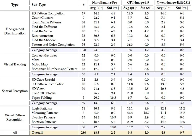 基于这一认识,研究推出了BabyVision-Gen,评估了3种前沿视觉生成模型:NanoBanana-Pro、GPT-Image-1.5和Qwen-Image-Edit在其之上的表现。