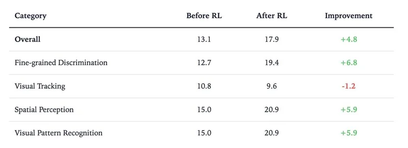 实验表明,在完成RLVR微调后,模型整体准确率提升了约4.8个百分点。从任务子类分布来看,大多数类别均出现不同程度的提升。这和在Qwen推理模型中得到的洞见一致:一旦提取出视觉信号,显式的中间推理可以部分抵消视觉上的不确定性。