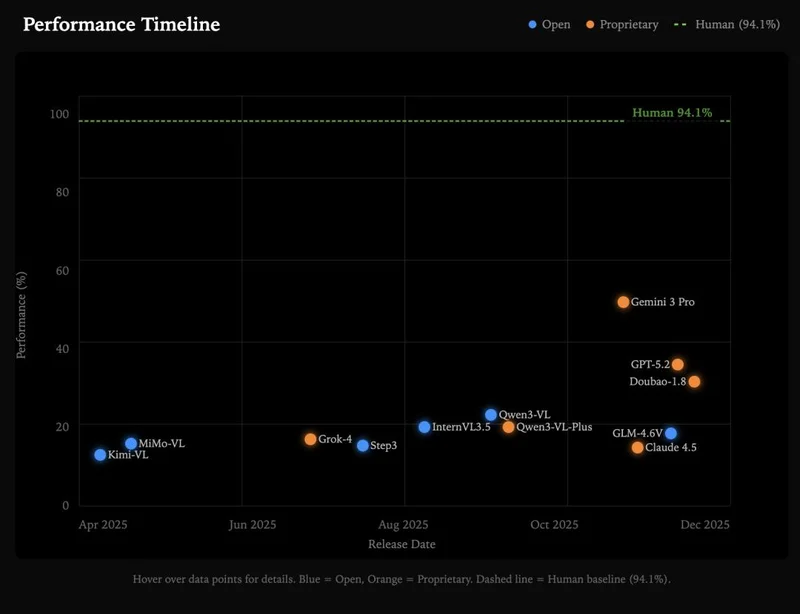 在闭源模型中: Gemini 3-Pro-Preview以49.7%的得分领跑,随后是GPT-5.2 (34.4%) 和豆包-Seed-1.8 (30.2%)。其余模型表现则不尽人意:Qwen3-VL-Plus 19.2%,Grok-4 16.2%,Claude-4.5-Opus 14.2%。