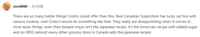 “Costco明明可以卖些更好的东西。Real Canadian Superstore就有招财猫造型的饼干礼盒,真希望Costco也能推出类似的产品。他们在亚洲商品上的选品真的令人失望,就连丘比蛋黄酱(Kewpie)都不是日本原版配方,而是美式配方(加拿大几乎所有其他超市都卖日式配方)。”