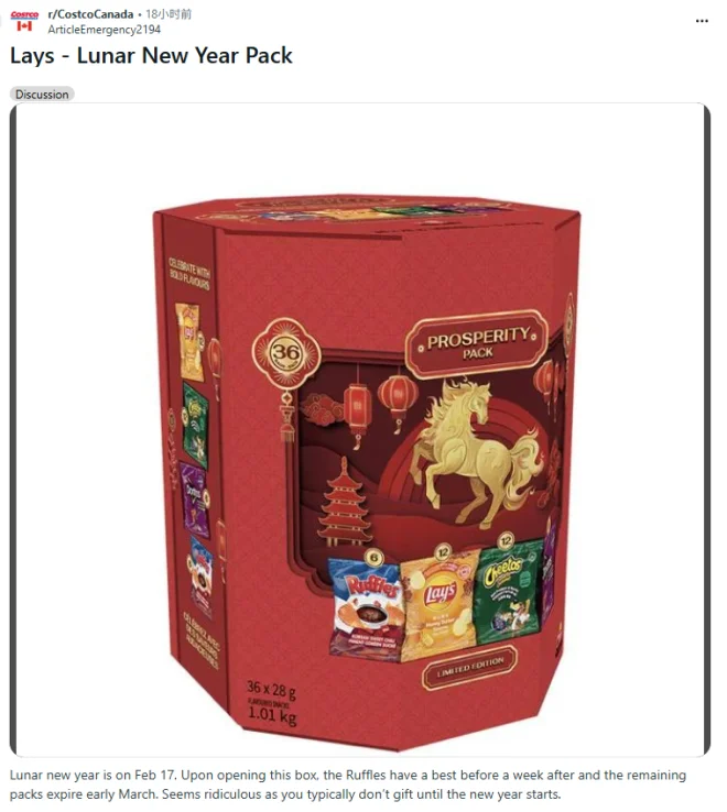 图源:reddit这款礼盒主打红色春节包装,名字也很应景——“Prosperity Pack(新年吉祥礼盒)”,内盒包含Lay’s、Ruffles、Cheetos等4个品牌的独立小包装薯片,一共36包,乍一看就是典型的“过年走亲访友型礼盒”。关键是价格还挺香:本周打折后只要14.99加元(原价18.99)。
