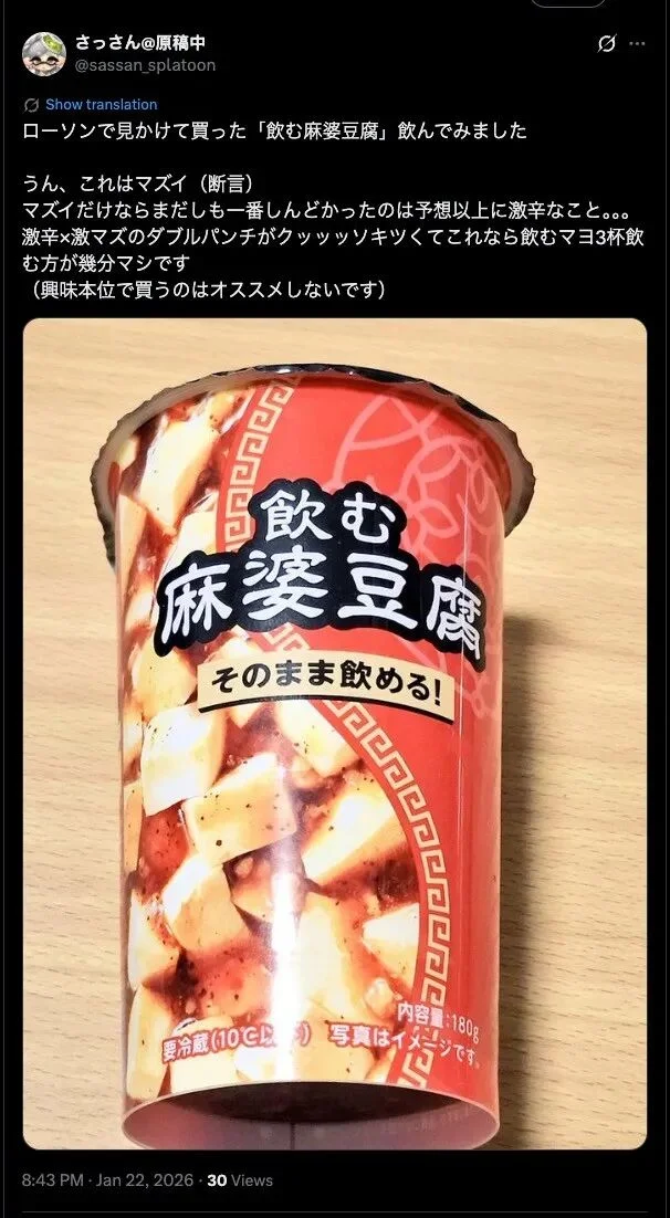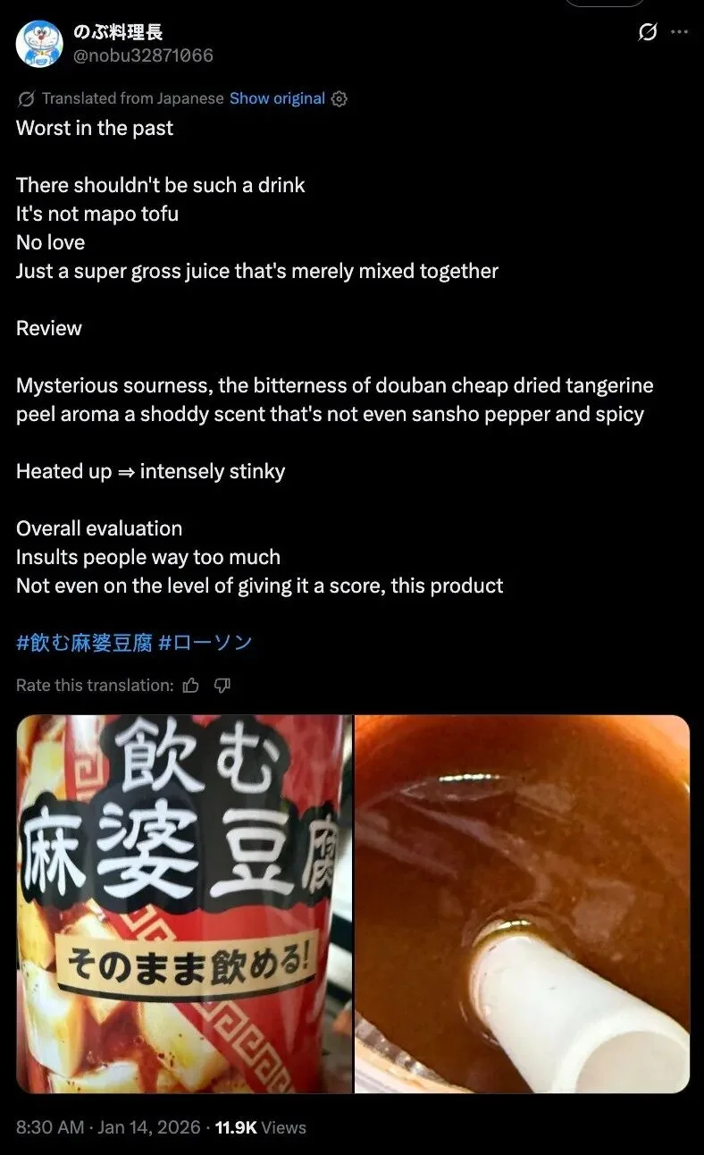 网上有人曾调侃:如果有人无法理解意大利对菠萝披萨的愤怒,就去看一看日本人对中国料理的改造吧…最近,日本对中国菜的改造又整出了新的抽象活:罗森便利店在本月13日面在全日本的分店上架了“喝的麻婆豆腐”(飲む麻婆豆腐)。