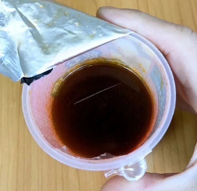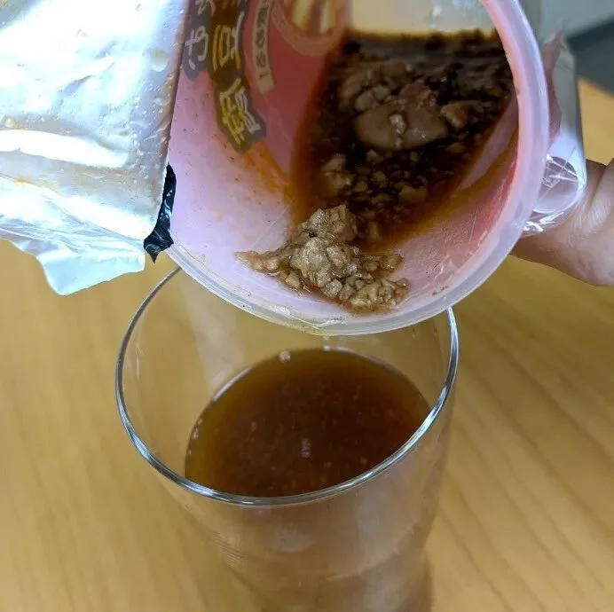(打开后的第一印象)把汤汁倒进玻璃杯后,杯底的块状沉淀物浮现了出来,含有豆腐和肉沫,说是麻婆豆腐好像也名副其实。
