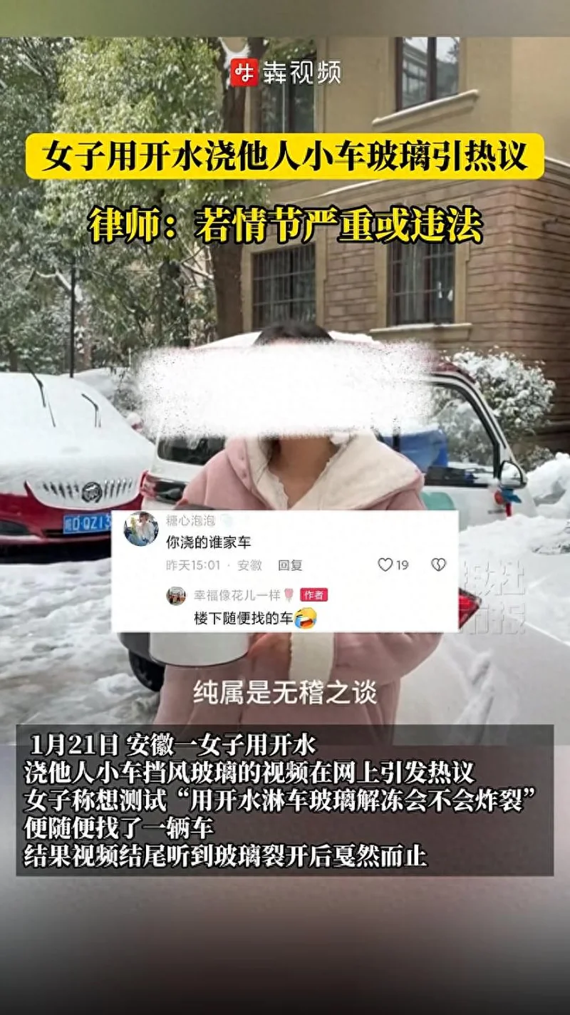 最近几天多地下雪,1月21日,一女子以测试 “开水淋车玻璃解冻是否会炸裂”为由,用开水浇淋冰雪覆盖的车辆挡风玻璃并发布视频引发热议。视频中,女子随机找了一辆小车进行测试,结尾处传来玻璃开裂的声响,视频随即戛然而止。不少网友留言表示:“这小车车主太倒霉”“你这行为不违法吗?”
