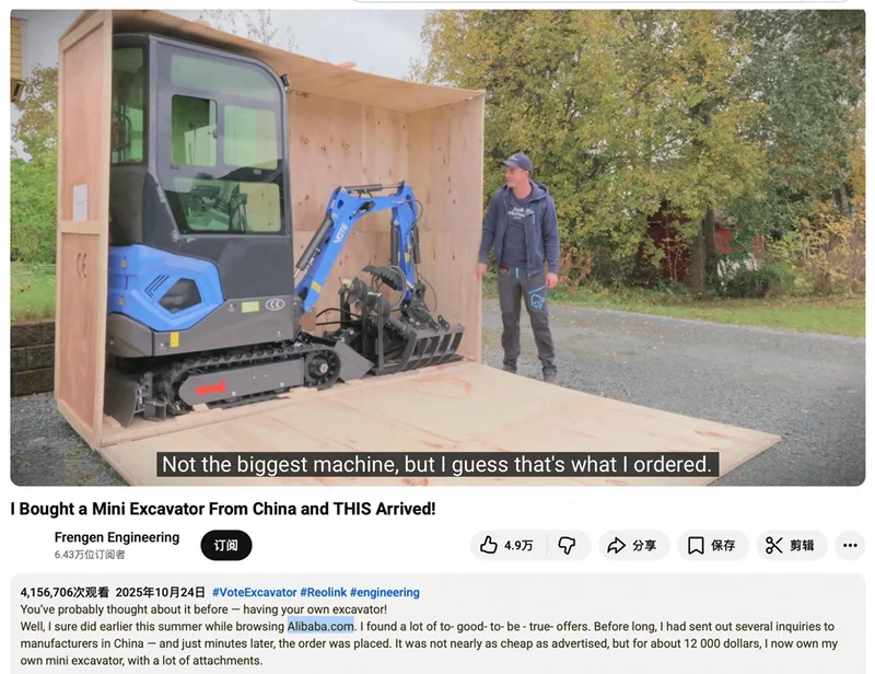 据了解,“阿里巴巴挖掘机”这个新词缘起于海外一位名叫Frengen Engineering的DIY视频博主。他在浏览阿里巴巴国际站时,发现一款标价仅2000美元的小型挖掘机。一开始其以为这只是玩具模型,出于猎奇心理下了一单。