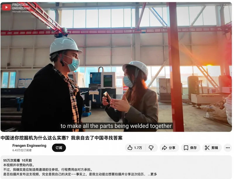 再从市场渗透上看,传统上,小型挖掘机等工程机械的出口主要面向专业采购商。然而,Frengen的视频无意间为阿里巴巴国际站这个B2B平台完成了一次现象级的破圈营销。它直接触达了全球庞大的家庭用户、小型农场主和DIY爱好者,开辟了一个巨大的增量市场。