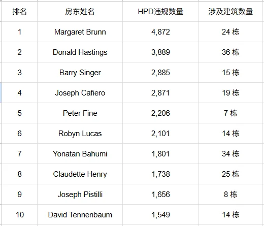以下是纽约市十大最差房东名单及其违规情况: